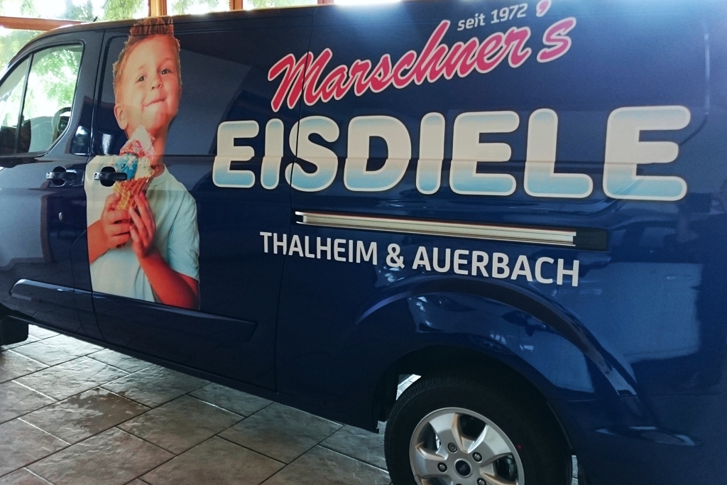 Marschner's Eisdiele - das Original im Erzgebirge - mit den Standorten in Auerbach und Thalheim ist schon seit Jahrzehnten weit über das Erzgebirge hinaus bekannt. Für den neuen Werbeauftritt wurden Logo und Corporate Design überarbeitet und auf Flyern, Bannern, Schildern, Fahnen und Fahrzeugbeschriftung umgesetzt.