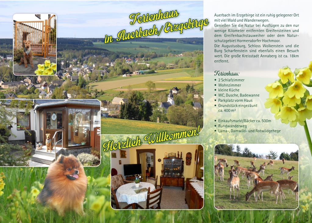 Speziell für Hundefreunde vermietet Marion Müller aus Venusberg verschiedene Ferienhäuser im Erzgebirge. Für die Urlaubsunterkünfte in Pobershau, Auerbach und Ehrenfriedersdorf entwarfen und druckten wir drei verschiedene Faltblätter.